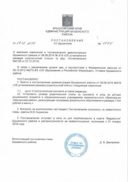 Постановление Администрации Шушенского района об установлении размера платы, взымаемой с родителей.jpg